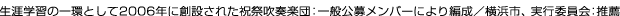 ♪♪♪♪ ★★★ ことしも1900名余の方々にご支援いただきました。 ありがとうございました。 ★★★ 出演各団体の高度な技術と音楽性にあふれた感動的な演奏、そして何よりも若い方々の演奏する喜びに満ちた表現により大きな拍手に包まれて終演を迎えることが出来ました。 これは実行委員会の私たちにとってこの上のない喜びでございます。 また、ことしは観客、出演者・関係者の数がとても多く、総計2672名と、過去最高の人数による開催となりました。 遠くからもたくさんのお客様にお越しいただきました。 感謝です。 公募による編成でことし3年目を迎えた祝祭吹奏楽団 ザヨコハマウィンドシンフォニー 2008の皆さん。 たった3ヶ月でしたが、練習のほかに新聞やTVの取材等、いろいろなことがありましたね。 いい思い出になりました。 「好きな時に、好きなだけ」楽しむことを目的に集い、その活動をとおして横浜の街づくりに一役買おうと考えています。 横浜生まれの日本吹奏楽をさらにひろめるためにも「もっと吹奏楽!」を皆さんと一緒に盛り上げていきたいと考えています。 来年も楽しみましょう! 東海大学付属高輪台高等学校・中等部吹奏楽部の皆さん、「さすが」だと思います。 「Joyful」では心が躍りました。 繊細でパワフルで。 何でもできる皆さんは素晴らしいと思います。 卒業しても「吹奏楽」を続けていってくださいね。 東京都立 杉並高等学校吹奏楽部の皆さんは、「スクールバンドの見本」と評価されるだけあり、大編成にもかかわらずサウンドプロポーションの良い合奏でした。 音楽性も豊かで多彩な表現を併せ持ち、なんといっても部長さんを筆頭とした眩しいほどの笑顔、笑顔。 なによりも楽しそうでした!! そして水戸市立 笠原小学校の皆さん、昨年に引き続き「文部科学大臣賞」の受賞おめでとうございます。 ことしも活き活きとしてみなさんの本領発揮でしたね。 年齢を感じさせないハイレベルな演奏で、 鳥肌が立ちました。 皆さんを支える多くの人の協力も力強いものでした。 とてもうらやましく思います。 最後に<特別出演>をいただきました神奈川県警察音楽隊の皆さま。 ありがとうございました。 トランペット・ソロやカラーガード。 特にガード・リーダーの演技には、国からご来賓の方々がとても感心されていました。 これからも日本を代表する警察バンドとして、また県民と警察との架け橋として頑張ってください。 ご出演いただきました皆さま、運営にて協力をいただいた皆さまに実行委員会一同、御礼を申し上げます。 本当にありがとうございました。 来年も6月7日(日)に開催を予定しております。 これからも「もっと吹奏楽!」をテーマに企画を進めて参りますので、ご指導、ご支援いただきますよう 何卒、よろしくお願いいたします。 ♪♪♪♪