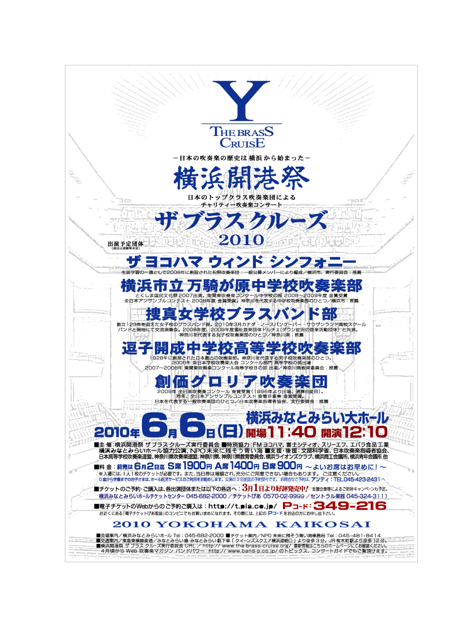 ♪♪♪♪ おかげさまで、ことしも 多くのご支援をいただきました。 ありがとうございました。 出演された皆さまの高度な技術と音楽性にあふれた感動的な演奏、そして何よりも若い方々の演奏する喜びに満ちた表現により大きな拍手に包まれて終演を迎えることが出来ました。 これは実行委員会の私たちにとってこの上のない喜びでございます。 ご来賓の法務大臣 千葉景子さまの開会ご挨拶や、国政、県会、市長、市会よりの議員をはじめとした多くの方々から激励をいただきました。 ありがとうございました。 おかげさまで 1528名のお客様にご来場、楽しんでいただきました。 本年もとても遠くからのお客様をお迎えしました。 お越しいただきました皆さま、ありがとうございました。 6月2日の横浜開港記念日の週は吹奏楽で決定 !!! 「6月の第一週は、吹奏楽ウイーク」を合い言葉に、日本各地で吹奏楽を盛り上げていきたいと思います!! みなさんもコンサートを開催し、吹奏楽に親しみ、吹奏楽を盛り上げていきましよう!!! これからも吹奏楽のさらなる普及発展を目指し「もっと吹奏楽!」を皆さんと一緒に盛り上げていきたいと考えています。 これからもよろしくお願いたします。 ご出演いただきました皆さま、運営にて協力をいただいた皆さまに実行委員会一同、御礼申し上げます。 ありがとうございました。 来年も6月5日(日)に開催を予定しております。 これからもご支援いただきますよう よろしくお願いいたします。 どうぞ、お楽しみに!!! ♪♪♪♪