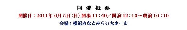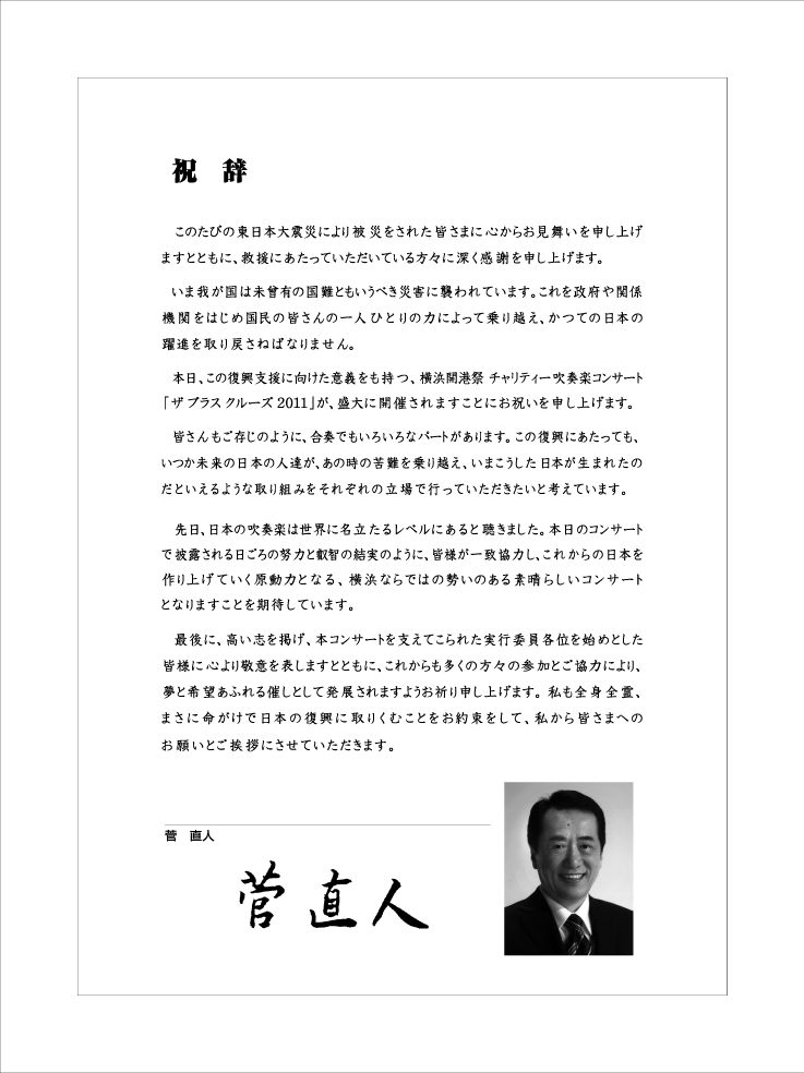 ♪♪♪♪ ★★★★★ 祝 ワールドカップ優勝 おめでとう! なでしこ ジャパン そして勇気をありがとう! ★★★★★ 同じ女性として、なでしこの皆さんが懸命に走る姿、ひたむきさに感動し、応援していて涙が止まりませんでした。 私たちも吹奏楽のさらなる普及発展を目指し「もっと吹奏楽!」を皆さんと一緒に盛り上げていきたいと思います。 今年で12回目の開催となりました今年のブラスクルーズは、約1600名余のお客様にご来場、お楽しみいただきました。 吹奏楽に始まり、管弦楽、合唱と、我が国の洋楽史をたどるかのような、盛りだくさんの内容でした。 ご来賓の、林 文子横浜市長も、エネルギッシュな演奏に触れて、大変喜ばれていました。 出演された皆さまの高度な技術と音楽性にあふれた感動的な演奏、そして何よりも若い方々の演奏する喜びに満ちた表現により、大きな拍手に包まれて終演を迎えることが出来ました。 これは実行委員会の私たちにとって、この上ない喜びです。 ご出演いただきました皆さま、運営にて協力をいただいた皆さまに、実行委員会一同、御礼申し上げます。 ありがとうございました。 7月7日には、神奈川県庁 知事室において、今年度の県知事賞受賞校である横浜隼人高等学校吹奏楽部代表者の方へ、黒岩県知事より直接、賞状を授与していただきました。 これを励みに、これからも素晴らしい吹奏楽活動を続けてください。 来年も、6月3日(日)に開催を予定しております。 これからもご支援いただきますよう、よろしくお願いいたします。 横浜開港祭 ザブラスクルーズ実行委員会は、 〜美しき日本の歌〜 東日本大震災によせて、唱歌・童謡など、日本のこころを歌う、東日本大震災復興支援チャリティーコンサート 「 凛 」の開催概要を発表し、前売券を発売しました。 ソプラノ 柳澤涼子 氏(洗足学園音楽大学准教授 二期会会員)、テノール 蔵田雅之 氏(フェリス女学院大学教授 音楽学部長 二期会会員)、バリトン 宮本益光 氏(日本声楽アカデミー会員 二期会会員)が饗宴。 良いお席はお早めにどうぞ! 詳細は、下記の「 凛 」をクリックしてください。 こちらもお楽しみに!! ♪♪♪♪