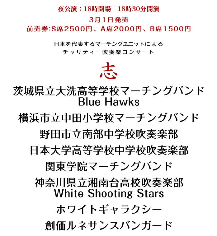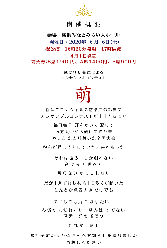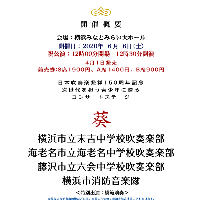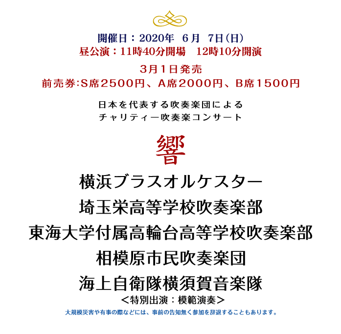 ♪♪♪♪ やっと先が見えてきましたね。 今回のことは、自然界の一員である人間のあり方、、人類に与えられた試練のようなもの、、、不確実性が高く、、素早く変異していく、、、、人知を超えたものにどう向き合うのかが試されているように思いました。 多くの先人が作ってくれた音楽に勇気づけられて解決策を探してきました。 私どもの苦渋の決断に対して、何卒ご理解をいただけますと幸いです。 横浜開港祭 チャリティー吹奏楽コンサート ザブラスクルーズは、毎年多くの皆様に支えられ、日本吹奏楽発祥の地である横浜を舞台に、国家を代表する音楽隊、吹奏楽団等による高いレベルの吹奏楽演奏会を通じて、広く音楽文化の普及・発展に努めて街づくりの一役を担う等を目的として開催し、本年で20年を数えることとなりました。 来年以降、再び皆様のお力添えを得て、近代国家日本の始まりをつくった横浜とペリー提督によってもたらされ、日本の洋楽の始まりとなった吹奏楽に感謝し、皆様を元気にするために是非とも開催したいと考えております。 引き続きご支援、ご協力をいただければ幸いです。 近々、お会いできることと思います。 お楽しみに。。 ♪♪♪♪