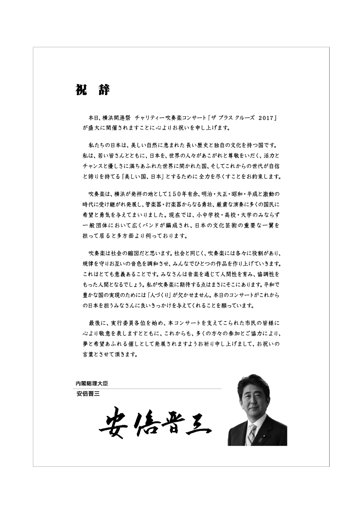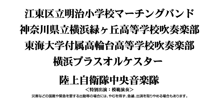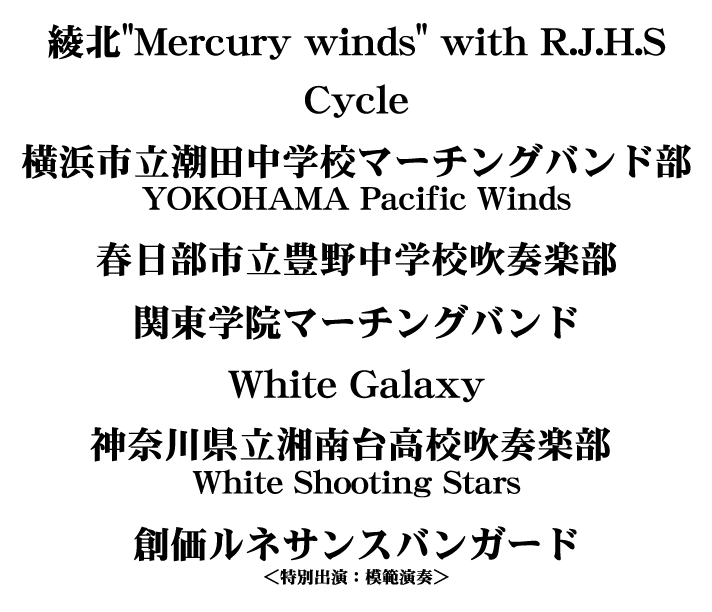 ♪♪♪♪ < AWARD 発表! > 今年度のブラスクルーズ表彰、報奨受賞者を発表いたします。 皆さんおめでとうございます! 詳細は下記バナーをクリックしてください。 東日本大震災、熊本地震により、被災された皆様に、心からお見舞いを申し上げます。 おかげさまで、18回目の開催となりました今年のブラスクルーズは、「共に祈り 共に立ち向かう」をテーマに、昼「響」、夜「志」の2公演で開催し、合計 約3400名余のお客様にご来場、お楽しみいただきました。 昼公演「響」の開会では、震災によって亡くなられた方への追悼と被災した方の一日も早い復興を願い、全員で黙祷を捧げました。 出演された皆さまの高度な技術と音楽性にあふれた感動的な演奏、そして何よりも若い方々の演奏する喜びに満ちた表現により、勇気づけられ、大きな拍手に包まれて終演を迎えることが出来ました。 これは実行委員会の私たちにとって、この上ない喜びです。 皆様からのアンケートに記された励ましのメッセージなど、涙が出る思いで読ませていただきました。 ありがとうございました。 これからも吹奏楽のさらなる普及発展を目指し「もっと吹奏楽!」を皆さんと一緒に盛り上げていきたいと考えています。 これからもよろしくお願いたします。 ご出演いただきました皆さま、運営にて協力をいただいた皆さまに、実行委員会一同、御礼申し上げます。 ありがとうございました。 来年も、6月3日(日)に開催を予定しております。 これからもご支援いただきますよう、よろしくお願いいたします。 「日本の吹奏楽発祥の地-横浜」で開催される当会のイベントは、皆様に「もっと吹奏楽を!」楽しんでいただけるように企画をすすめております。 出演団体や演目などの最新情報は、このホームページにて発信していきます。 どうぞお楽しみに!! ♪♪♪♪